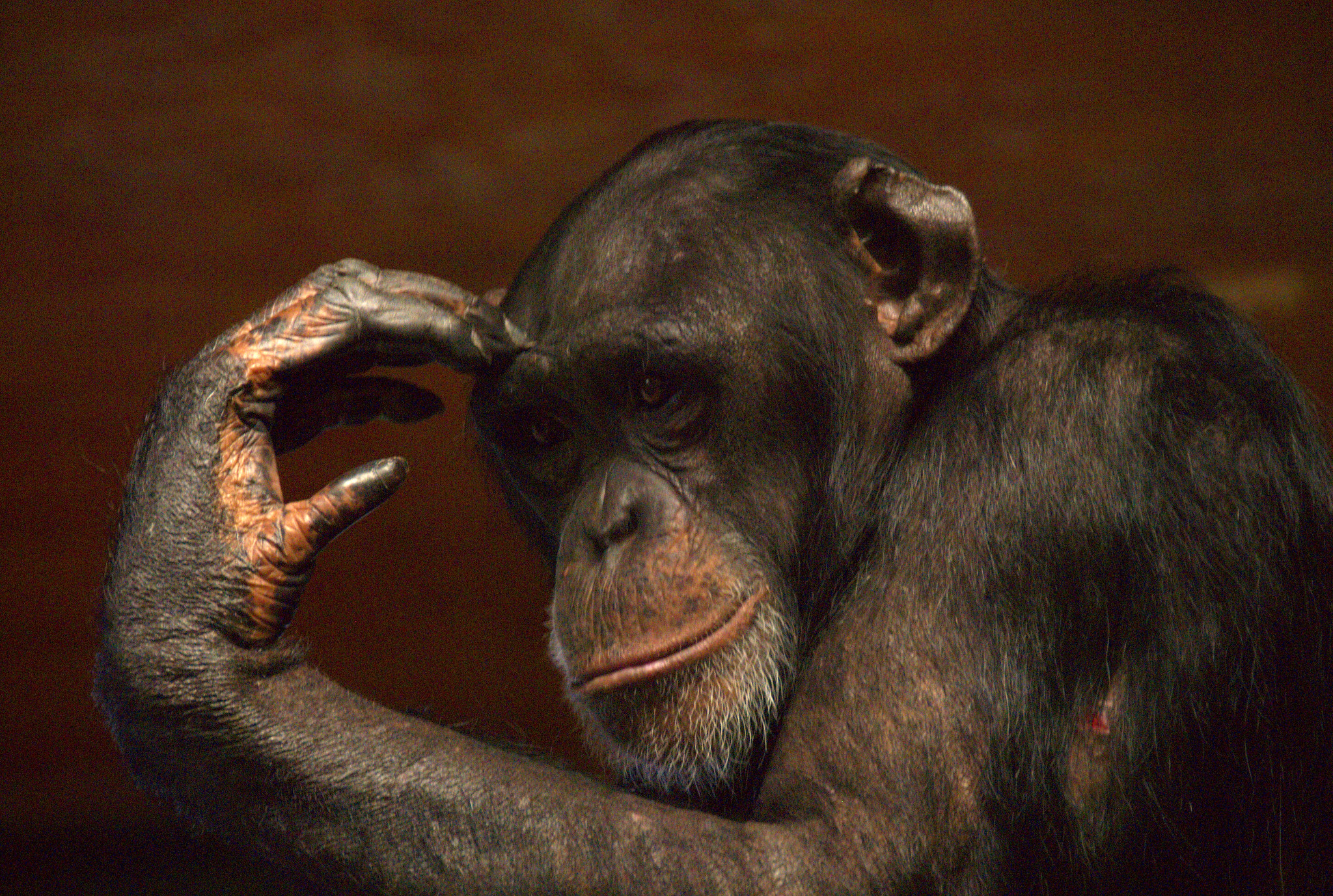 What amazed me was that there are online groups, where peoplevisit the sanctuary so frequently, they recognise individual chimps. So I found out that my photo today is of Marjolene. I love her pensive expresssion. I remember having to play with the camera settings, as we were indoors, she was behind glass, and I didn’t want to get glare by using a flash.