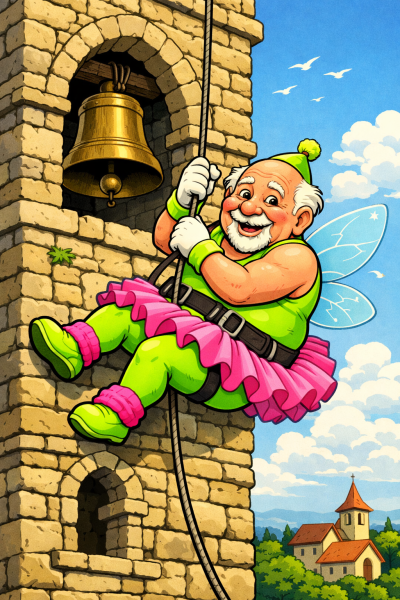 It wasn’t how we expected a vicar to dress. Or behave, for that matter. The fluorescent green leotard visibly bulged as it struggled to contain Pastor Ted’s generous love handles. But there he was. Unmistakeably highlighted against the darkening sky. How he even managed to climb to the top of the ancient bell tower, we never knew. But there he was, in all his glory.